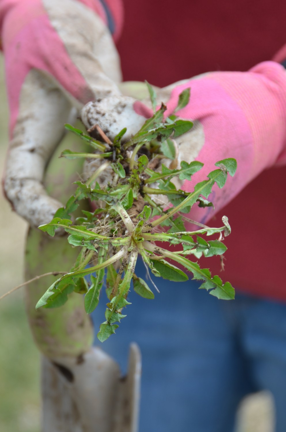 Dandelions (Taraxacum) are the bane of the neat gardener. In the spring they grow fast using the energy stored in their tap-roots. Before you know it they will be cheerfully flowering and then quickly producing many wind blown parachute-like seeds. After the snow melt and spring rains the soil is moist enough to easily dig out perennial weeds like dandelions. Use a long trowel or a specific tool called a dandelion weeder or dandelion fork. You could also use a wide old screwdriver to dig down deeply into the earth and remove the whole root that resembles a thin carrot. Any parts that you leave behind are likely to root so the more that you can get out the better. I like to remove dandelions from the beds and borders but I am not so particular about the lawn.