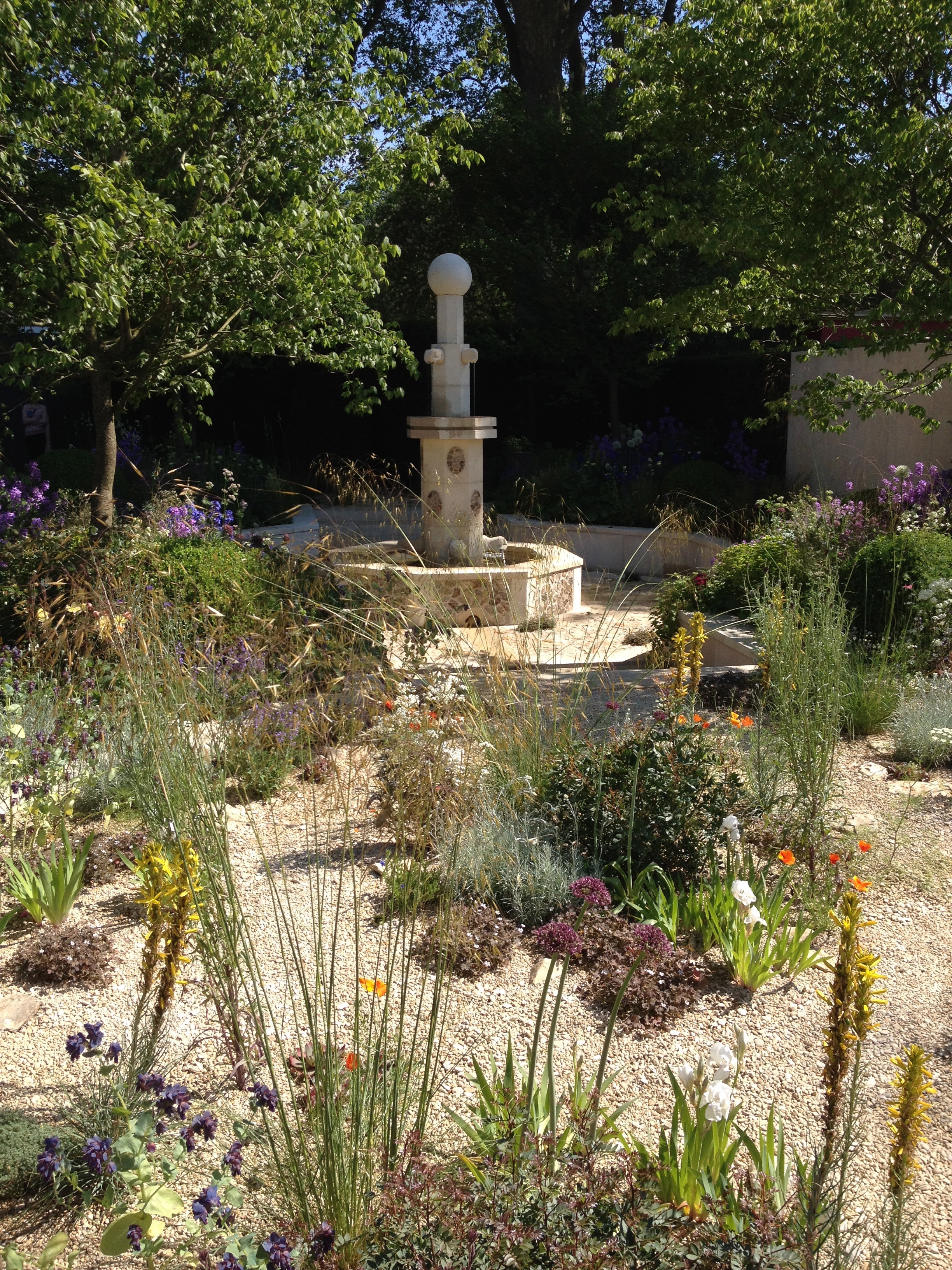 M&G Investments is the show sponsor of the RHS Chelsea Flower Show; their garden, designed by Cleve West, is based on ancient Persian garden designs but with a modern twist. The design is divided into the traditional four quartered sections with a sunken central carved stone fountain and four watery rills. The yew hedges and carved limestone panel behind the fountain provide the feeling of an enclosed oasis. Plants to the left are of the blues and purples and to the right there is jellybean-colored floral display set in an arid, pebbly area suggesting the geographic home of the original design inspiration. As usual Cleve West does not disappoint. His design and plantings pack a horticultural punch to whisk the visitor away to what I was going to call warmer climes- but today I cannot do that as the day was sunny. bright and downright hot at times. A perfect way to begin Chelsea Flower Show week.