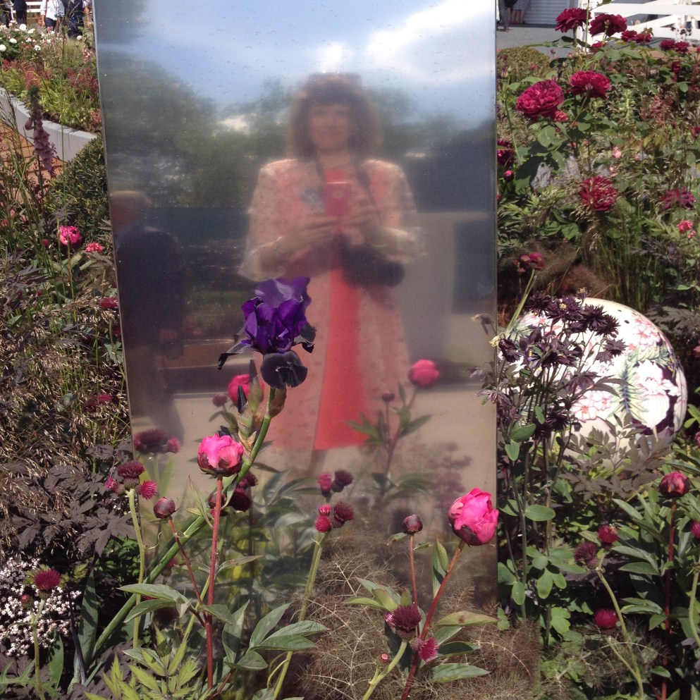 At the RHS Chelsea Flower Show – a ‘selfie’ taken as a reflection in the in the polished steel garden arches of the “Positively Stoke-on-Trent” exhibit. To the right is a Moorcroft Pottery sphere featuring images of plants in the show garden. Great exhibit!