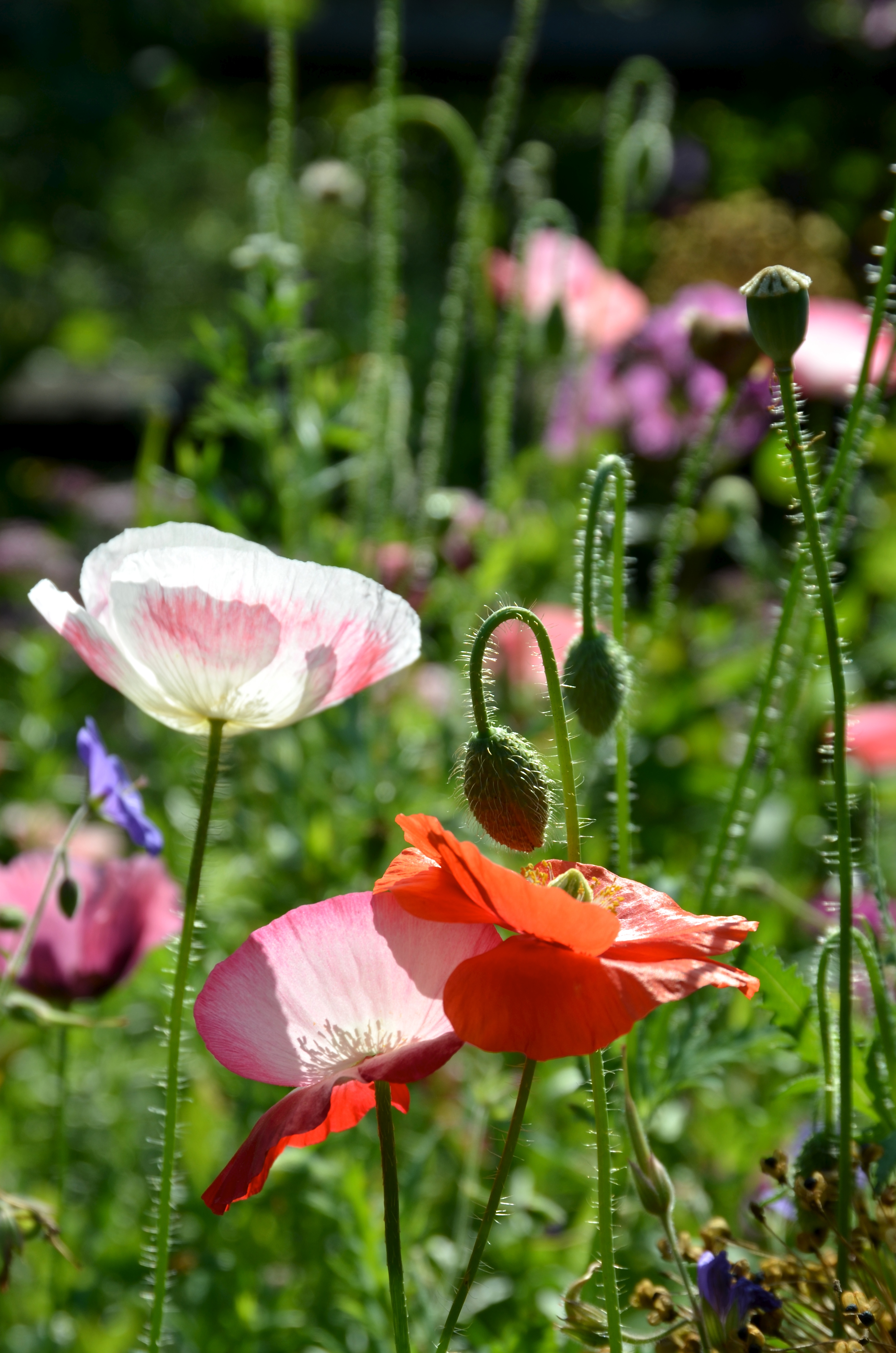 I dreamt about this day in January whilst nodding off by the fireside; a sparkly June morning and poppies in full bloom. We sprinkled tiny poppy seeds onto the melting snow and waited. The reward is a plethora of poppy blooms in shades of pink, coral, red and white. Petals as translucent and fragile as bone china wobble atop hairy stems. Pollen stuffed stamens buzz with hoverflies and honey bees.