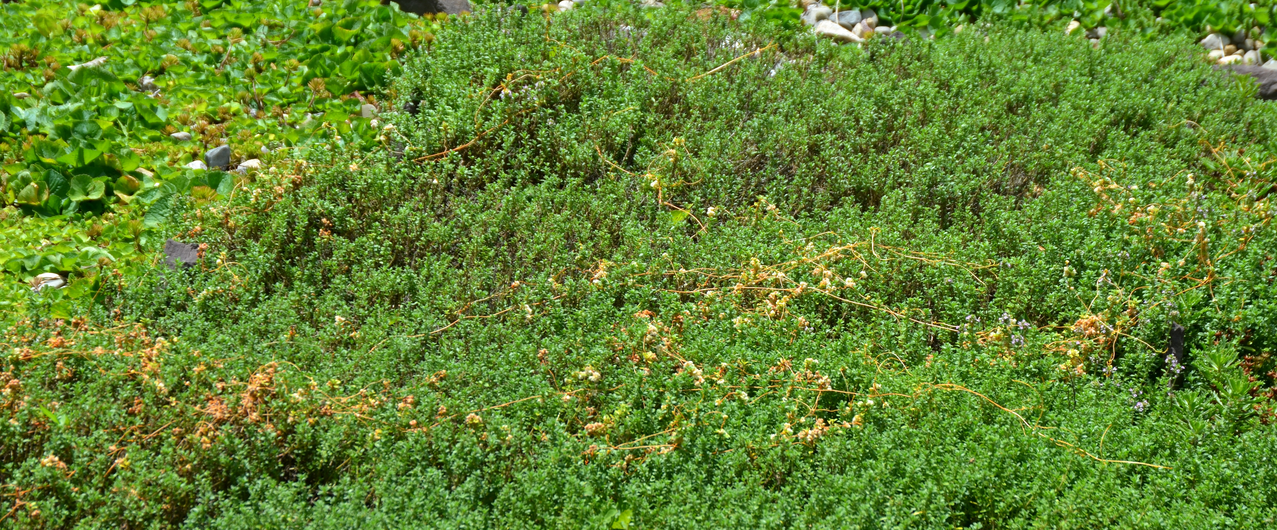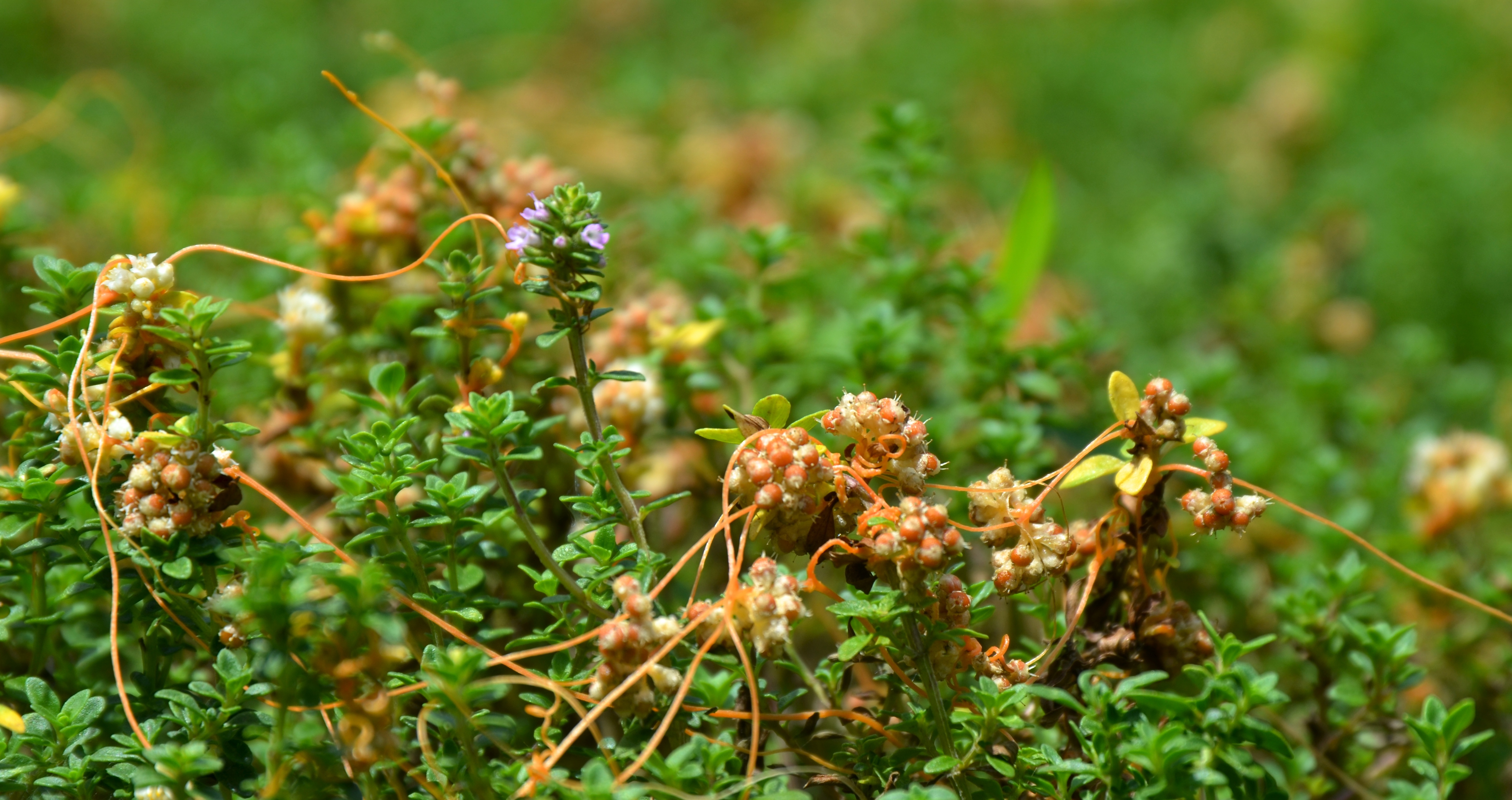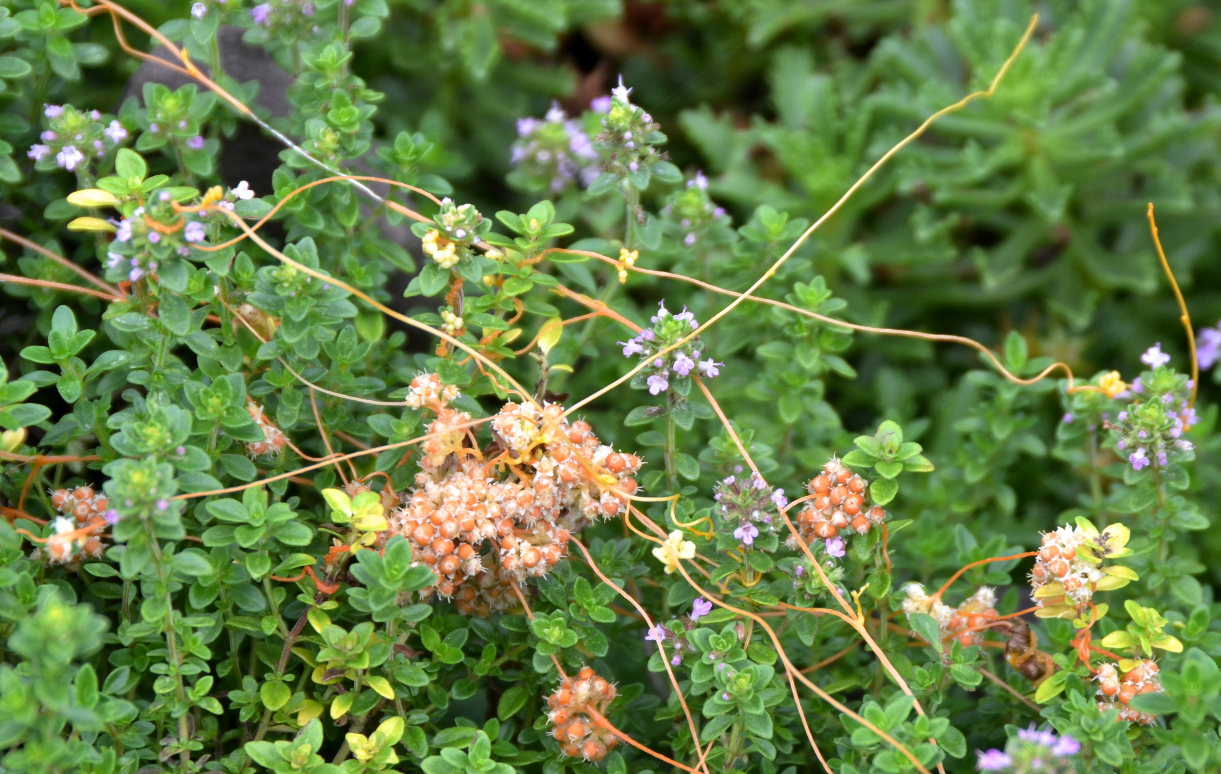 Thyme Dodder punctures the thyme plant – its unwilling host- using an attachment structure called a haustoria. It taps into the thyme stem and extracts water and nutrients.