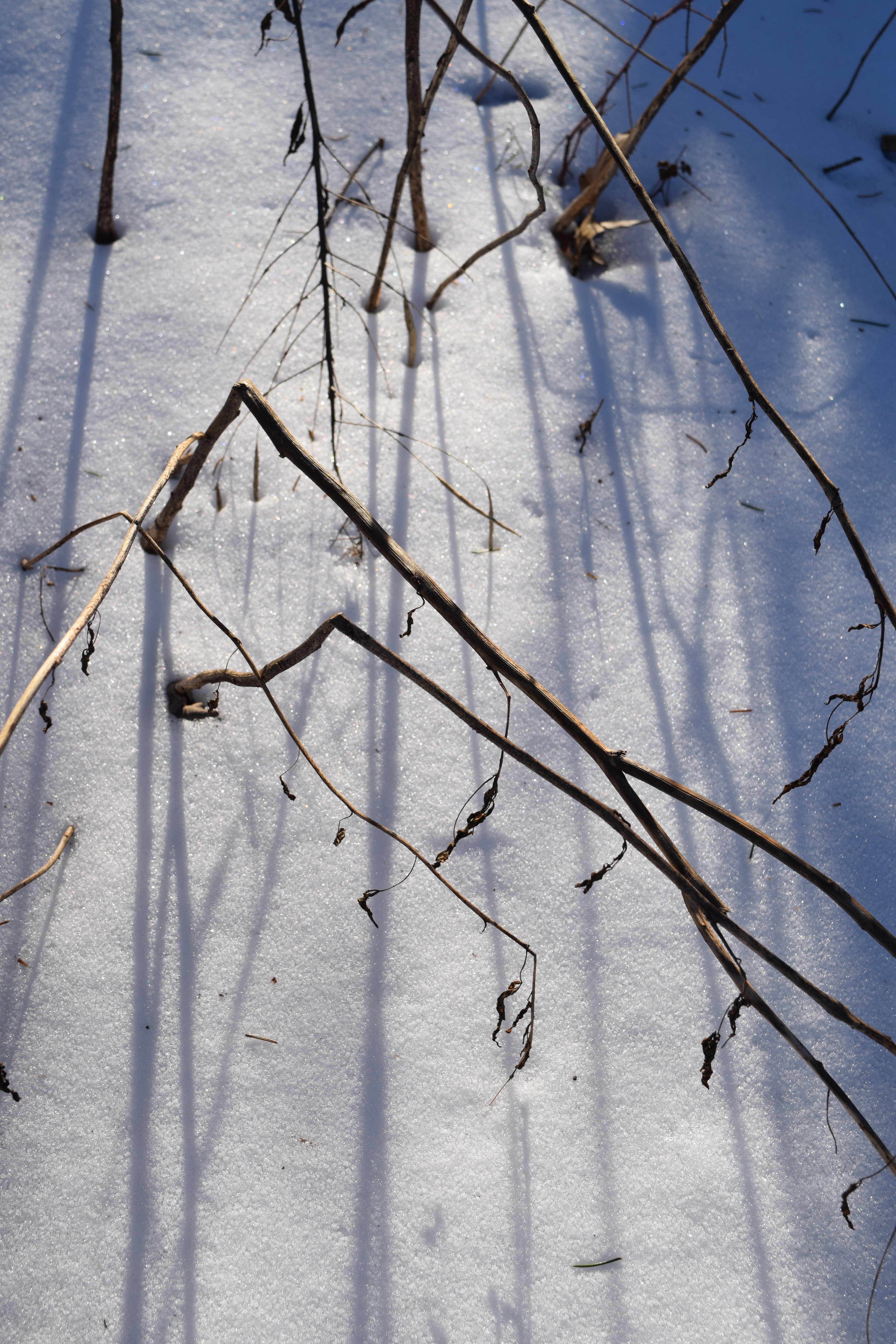 The winter garden is shades of sepia and white. The tiny details of old plant stems are outlined in relief against the bright shiny snow. Shadows are a great reason to leave some plant stems standing for the winter. It also shows that animals that you thought were being kept out of the fenced herb garden are freely hopping through the garden. Mr. McGregor would be mad. Spring will be the time to fix the fence not now.