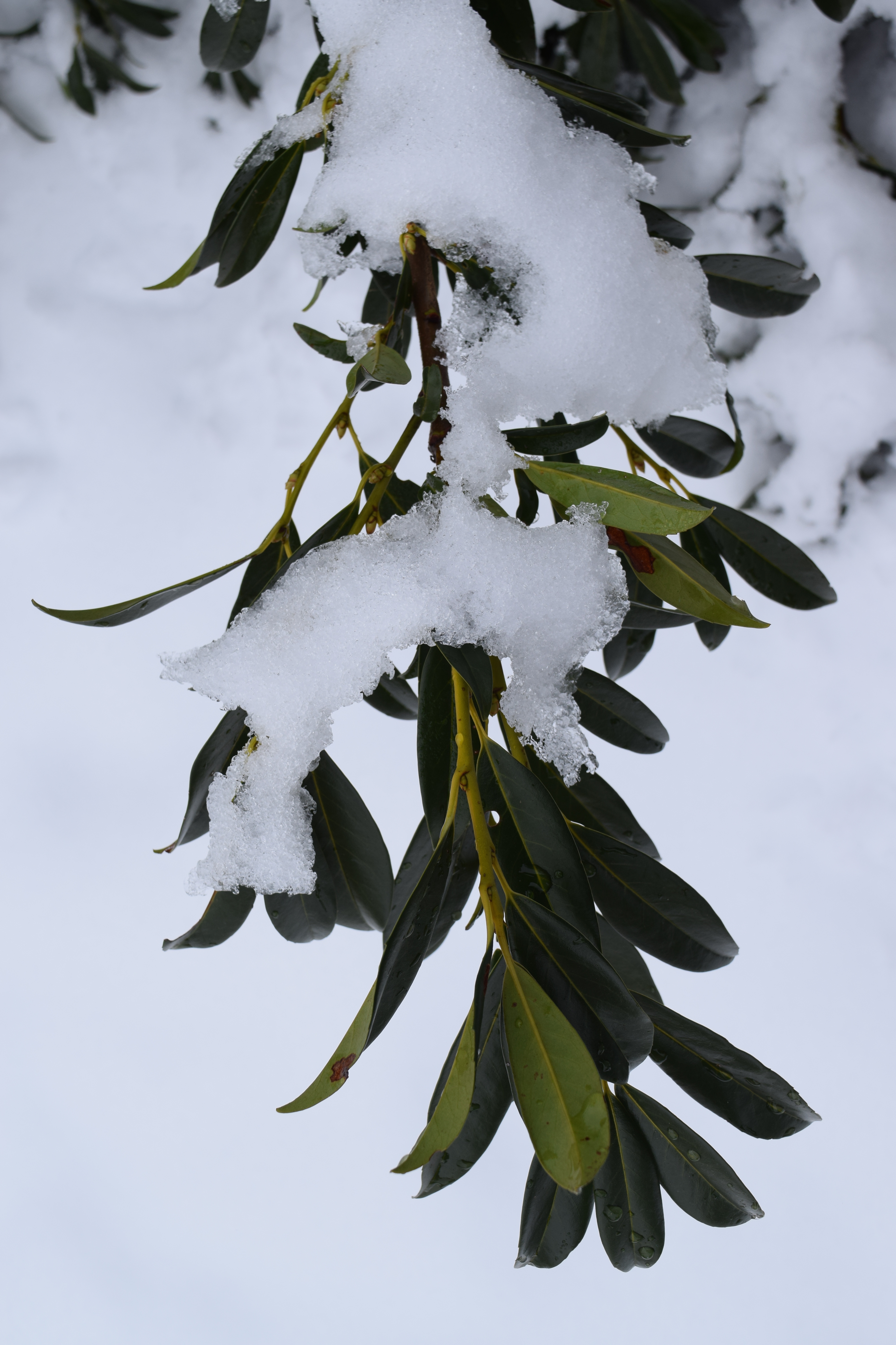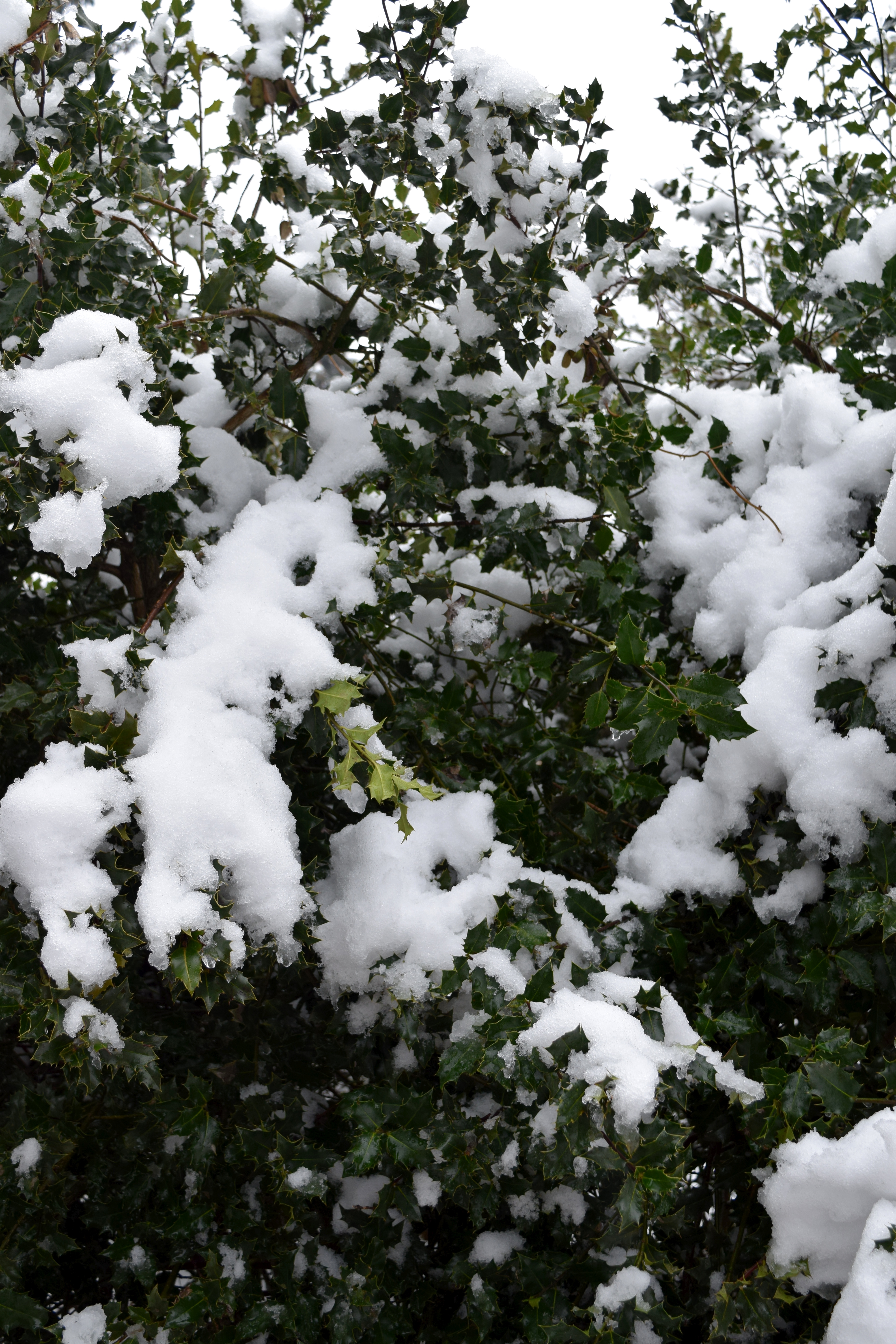 With one heavy wet snow this week and two more larger snowfalls expected, it is time to think of ways to prevent snow damage to your trees and shrubs. The first way is smart plant choice, and coniferous evergreens with needles are one of the best for a snowy climate. Not only are many of them very cold hardy but their shape sheds snow off their branches. Broad leaved evergreens, such as Cherry Laurel and evergreen hollies, have large surface areas to catch the snow and ice. A technique that we use to keep columnar trees upright is to use biodegradable twine and bind them up to keep the branches from splaying apart. The next technique is sensible pruning to keep the shrubs tight in shape, with hedges pruned slightly wider at the bottom, to shed the snow.