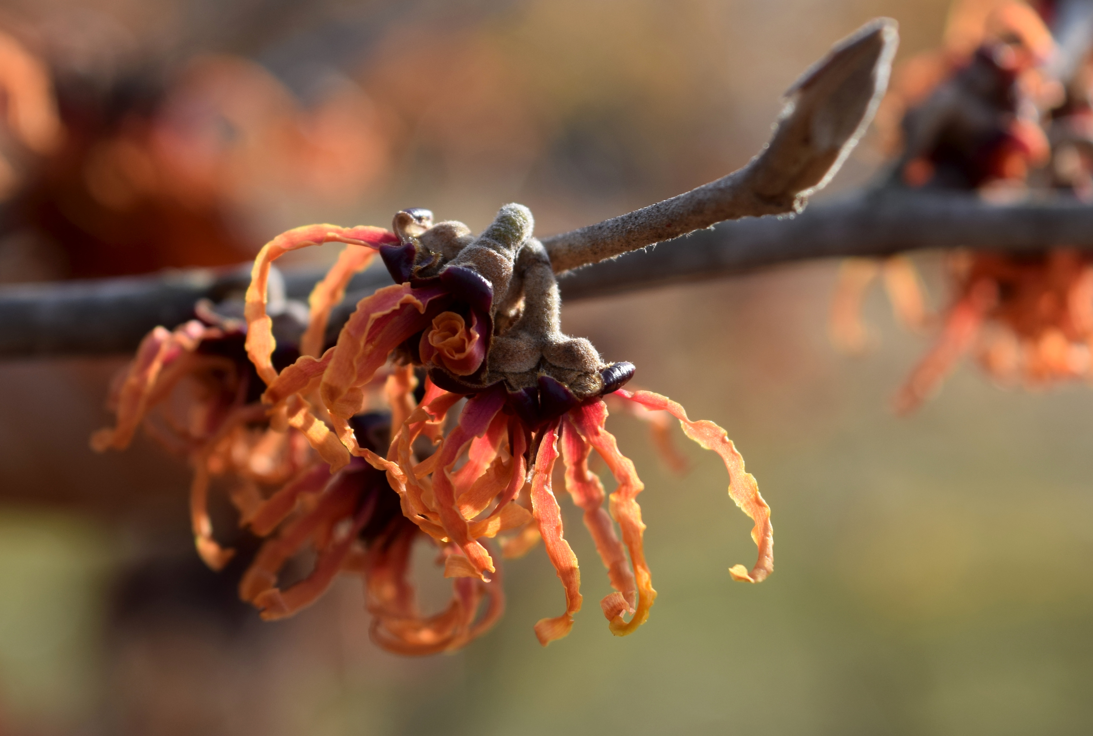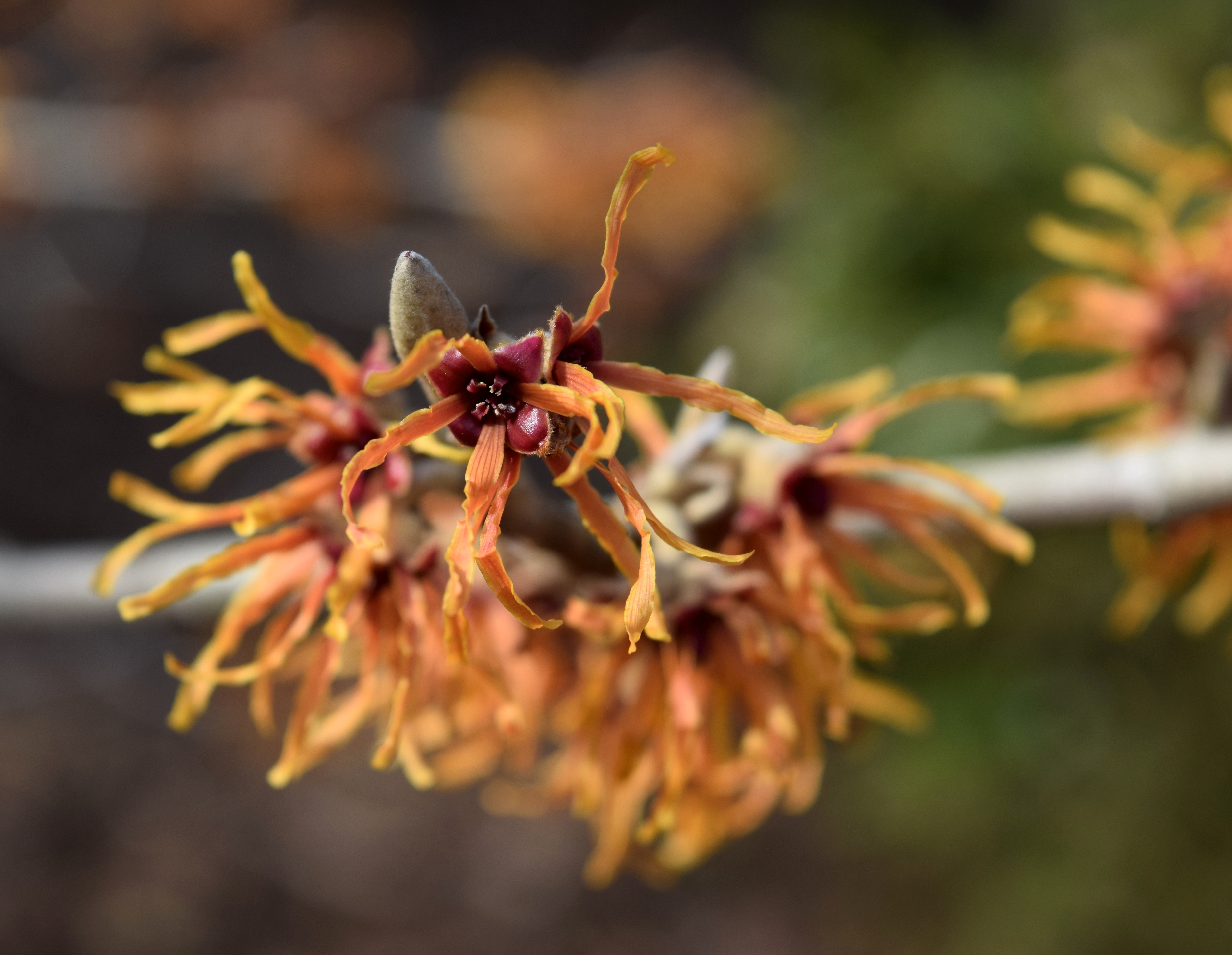 Witch hazels are large shrubs that for much of the year have green leaves but are not spectacular. The leaves of some witch hazels, such as Hamamelis x intermedia ‘Jelena’, color up nicely in the autumn. But late winter or early spring is their season to shine, with flowers in colors of yellow, orange or red. Their fragrances are citrusy, spicy or fruity blends that waft on warm breezes/cold winds to your unsuspecting nose. The scent is spring-like, maybe reminiscent of daffodils or hyacinths (we have none out yet). A true harbinger of spring – we hope.