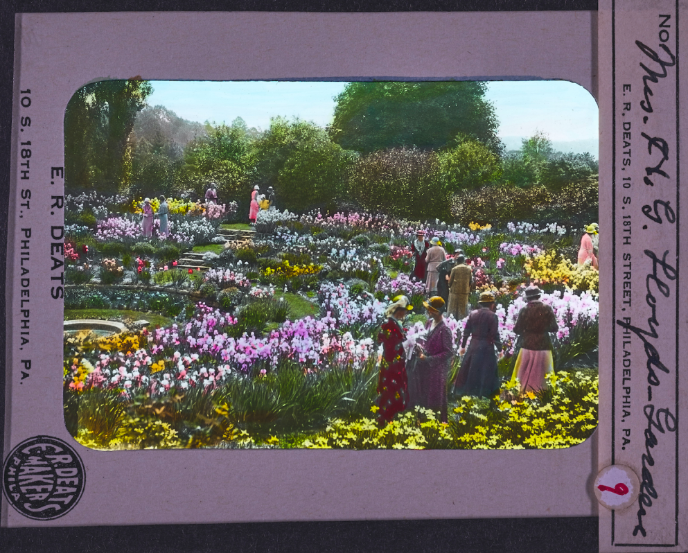 The attached lantern slide from the Pennsylvania Horticultural Society’s Collection of Mary Helen’s famous Iris garden is one of the many lantern slides currently being digitized through a project supported by a grant from the Pennsylvania Historical and Museum Commission’s Historical Archives and Records Care Grant, a program funded by the Commonwealth of Pennsylvania.