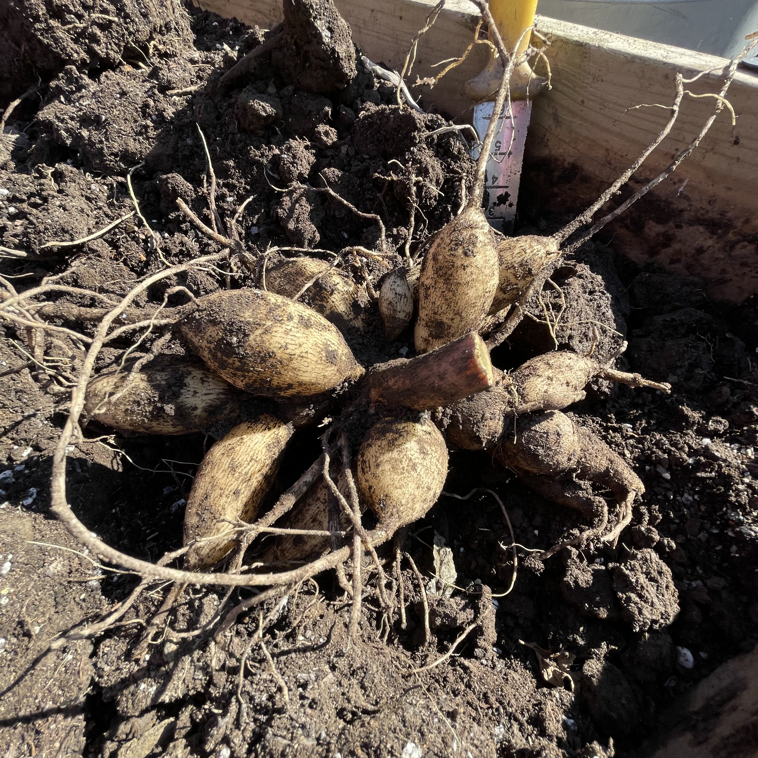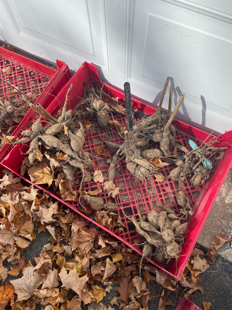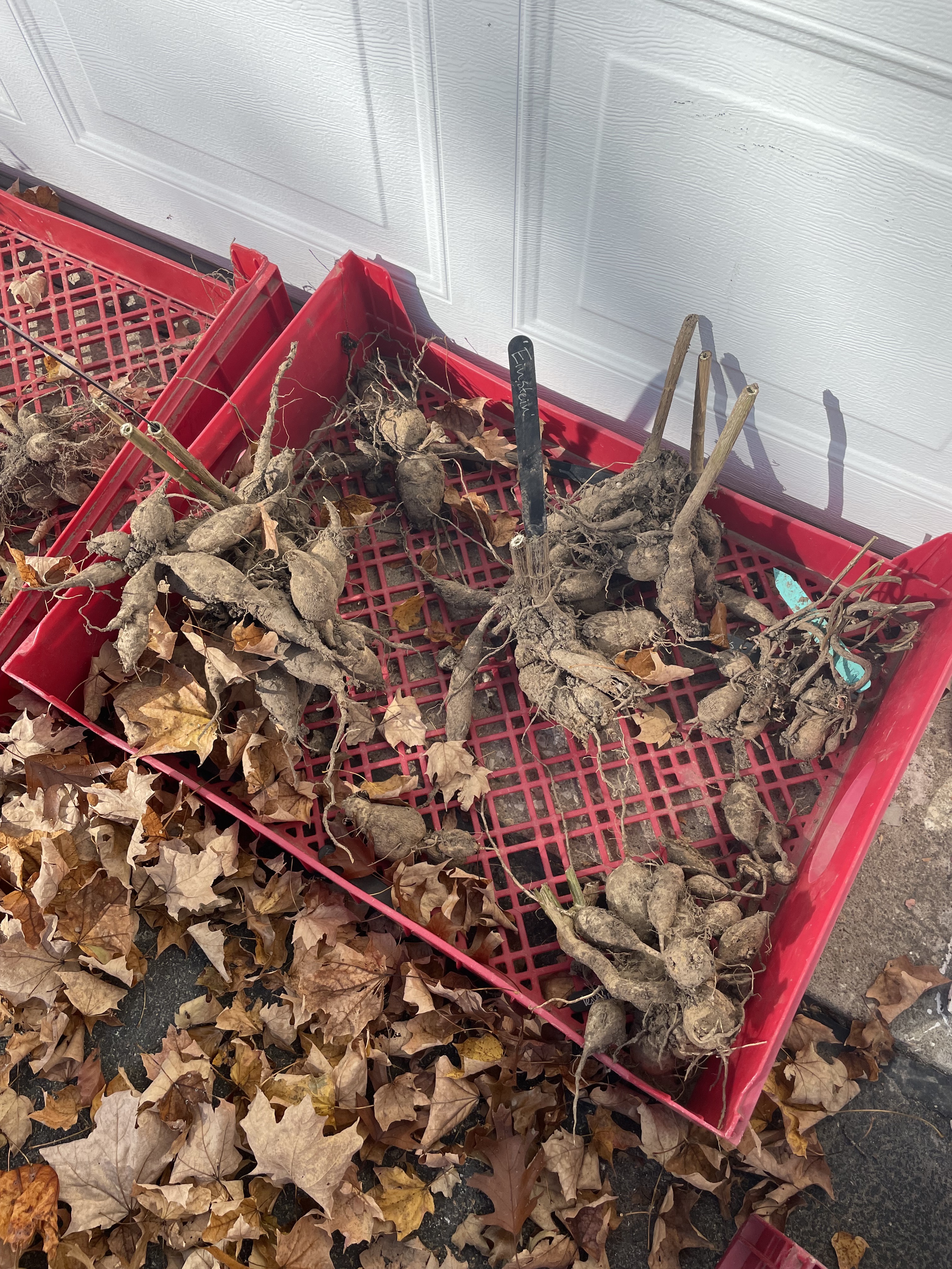 Dahlia tubers drying off in a crate. Turn them upside down to let water drain out of the hollow stems
