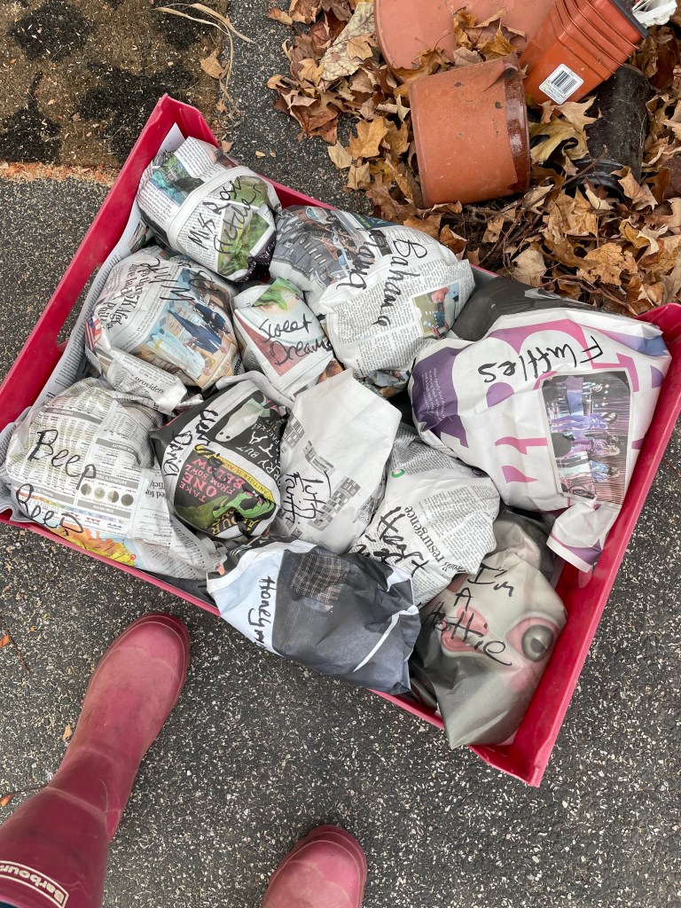 Next, I wrap the tuber in multiple layers of newspaper to protect it over winter. If there was a plant label that gets wrapped up in the package too. I take a permanent marker and write the name of the dahlia on the outside of the paper. It is infuriating if you lose the name and have no idea whether your dahlia is small or tall, and what size or color of bloom it is.
