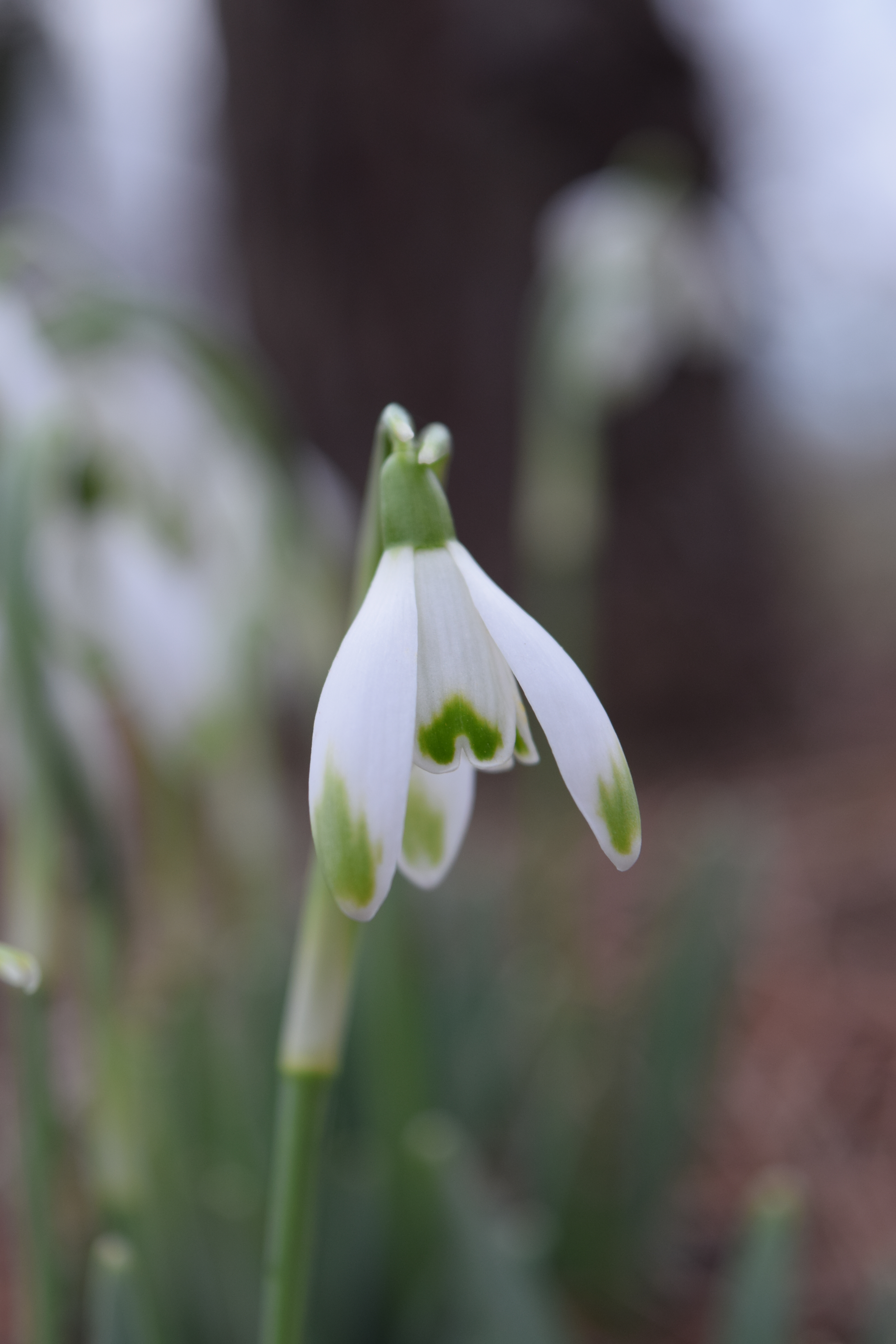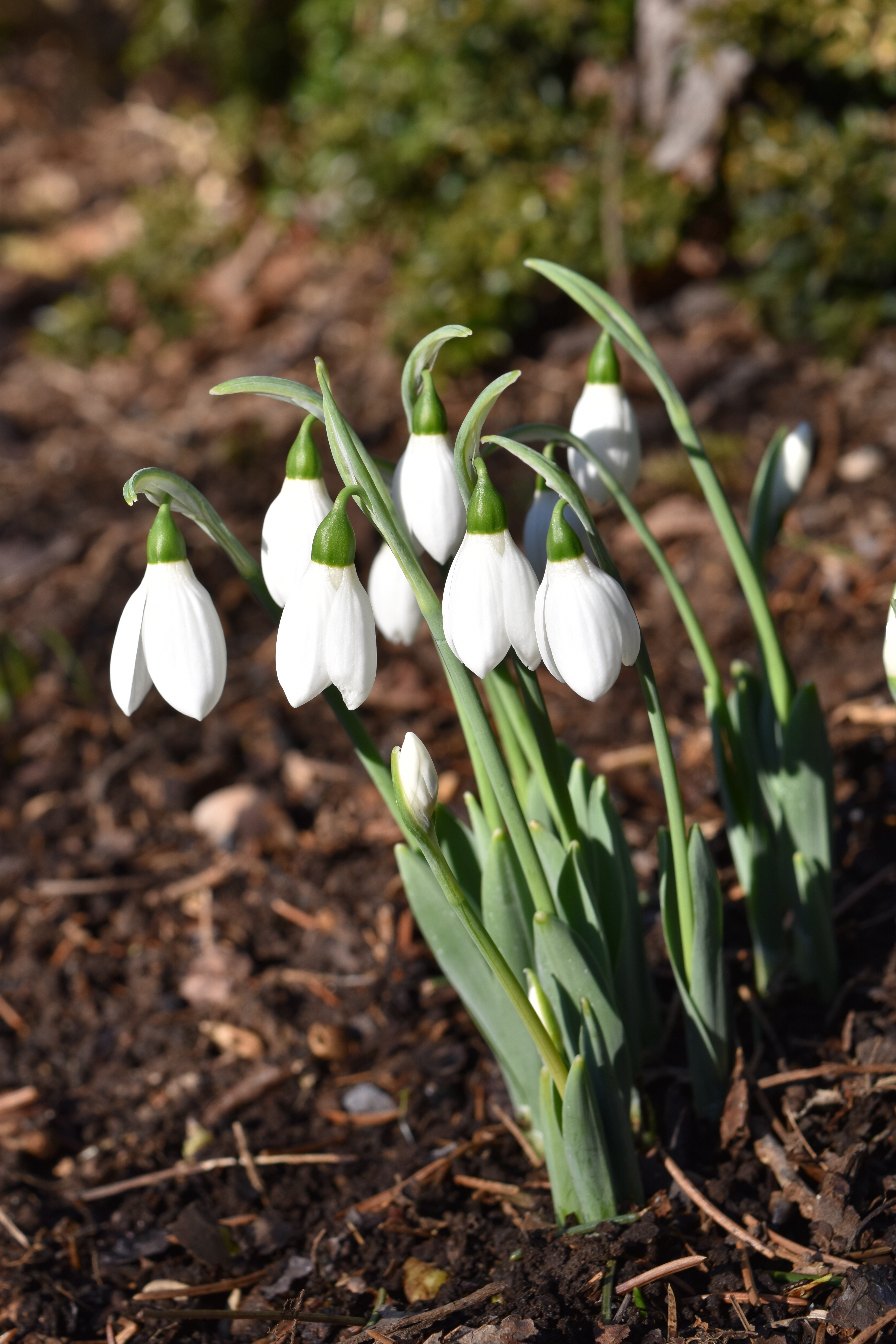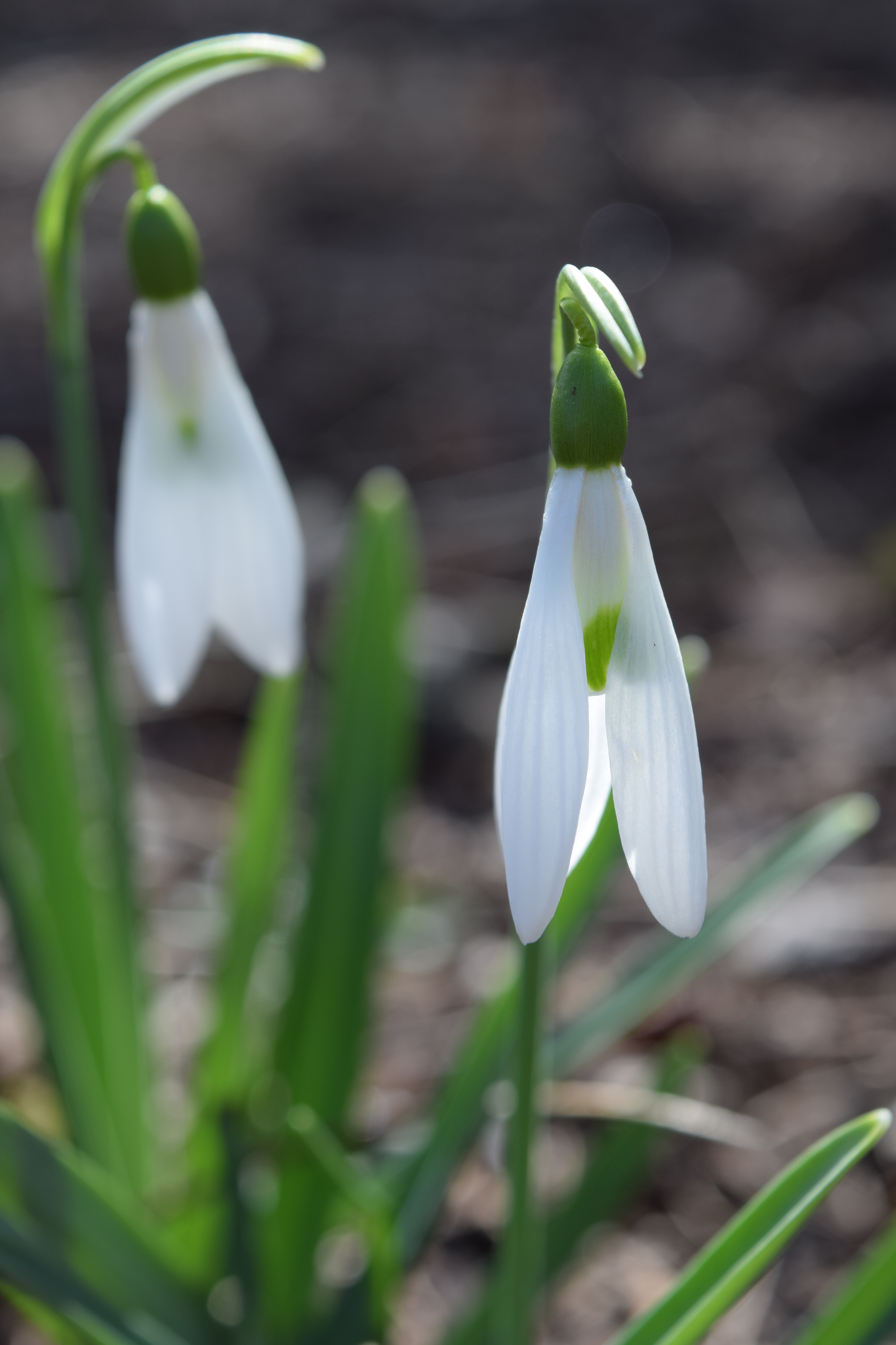 Up through the frozen or snowy soil pop pointed green leaf shoots, sometimes referred to as noses. Over the course of the next few weeks, the noses elongate, just like Pinocchio’s nose after he has told a lie. Rising up between the compact leaves there is a tiny pearl drop of white that will become the future flower. The flower stalk elongates and the flower head turns 180 degrees to become a dangling bud that gradually opens to reveal the fully formed flower.