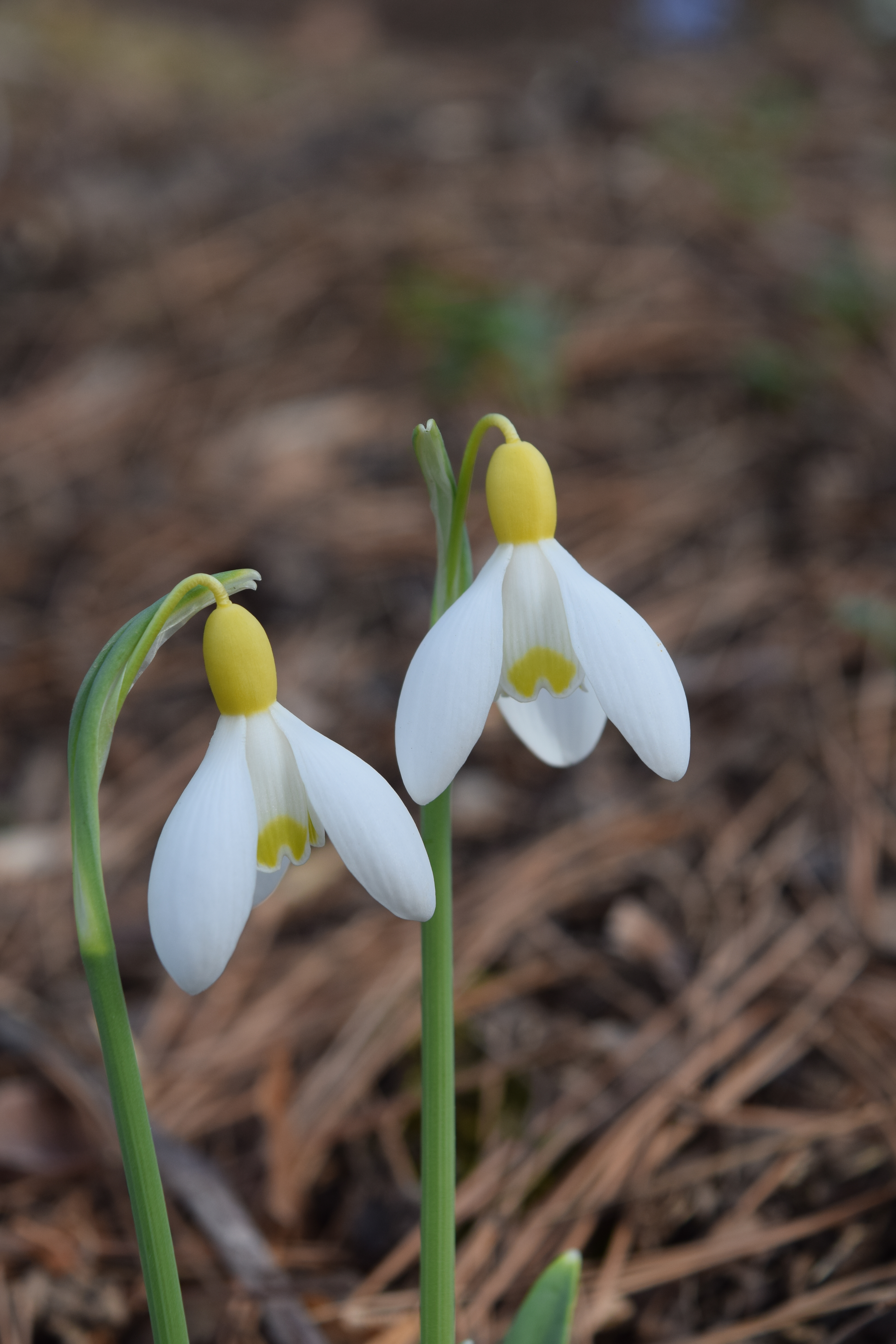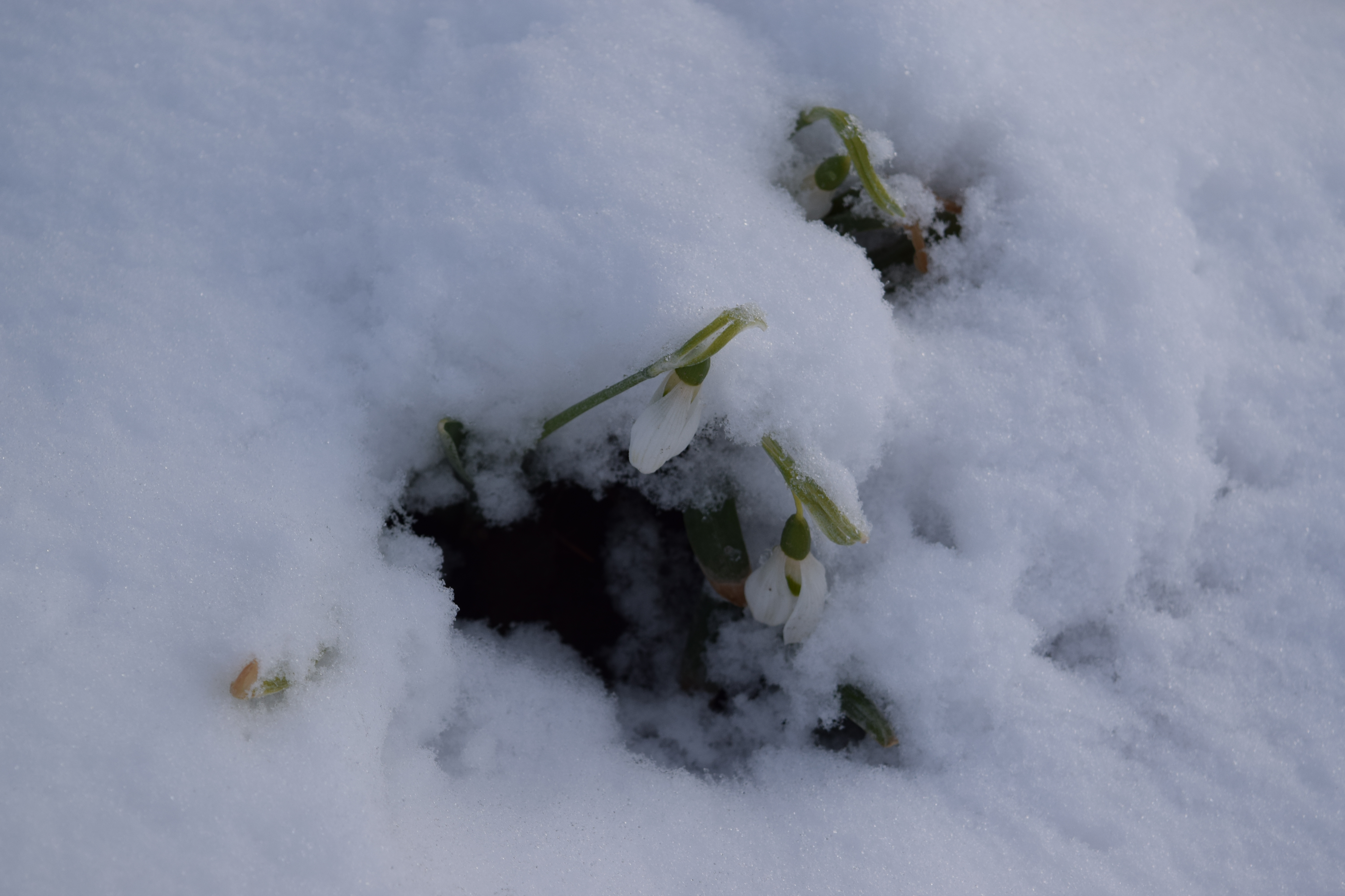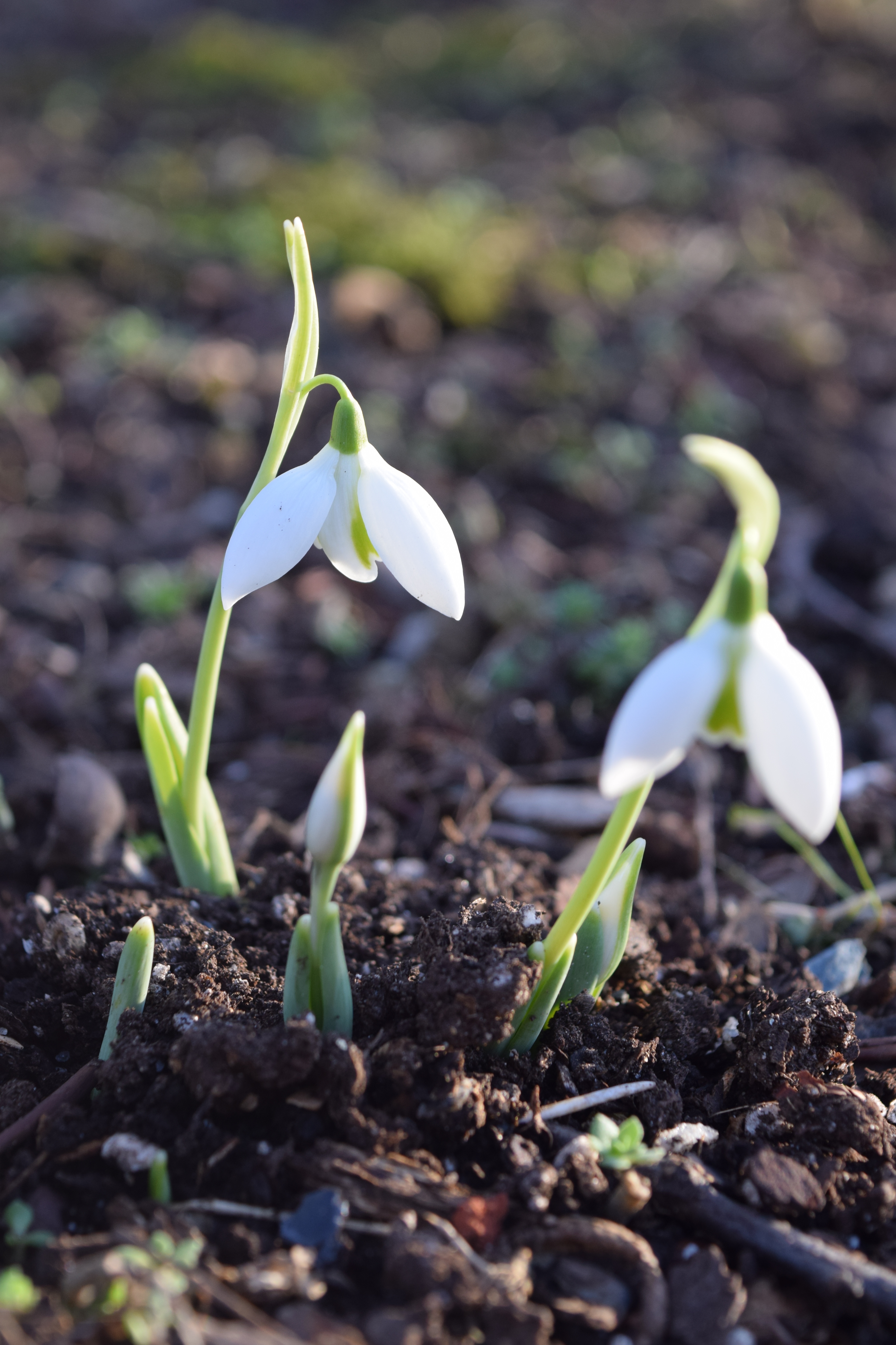 Up through the frozen or snowy soil pop pointed green leaf shoots, sometimes referred to as noses. Over the course of the next few weeks, the noses elongate, just like Pinocchio’s nose after he has told a lie. Rising up between the compact leaves there is a tiny pearl drop of white that will become the future flower. The flower stalk elongates and the flower head turns 180 degrees to become a dangling bud that gradually opens to reveal the fully formed flower.