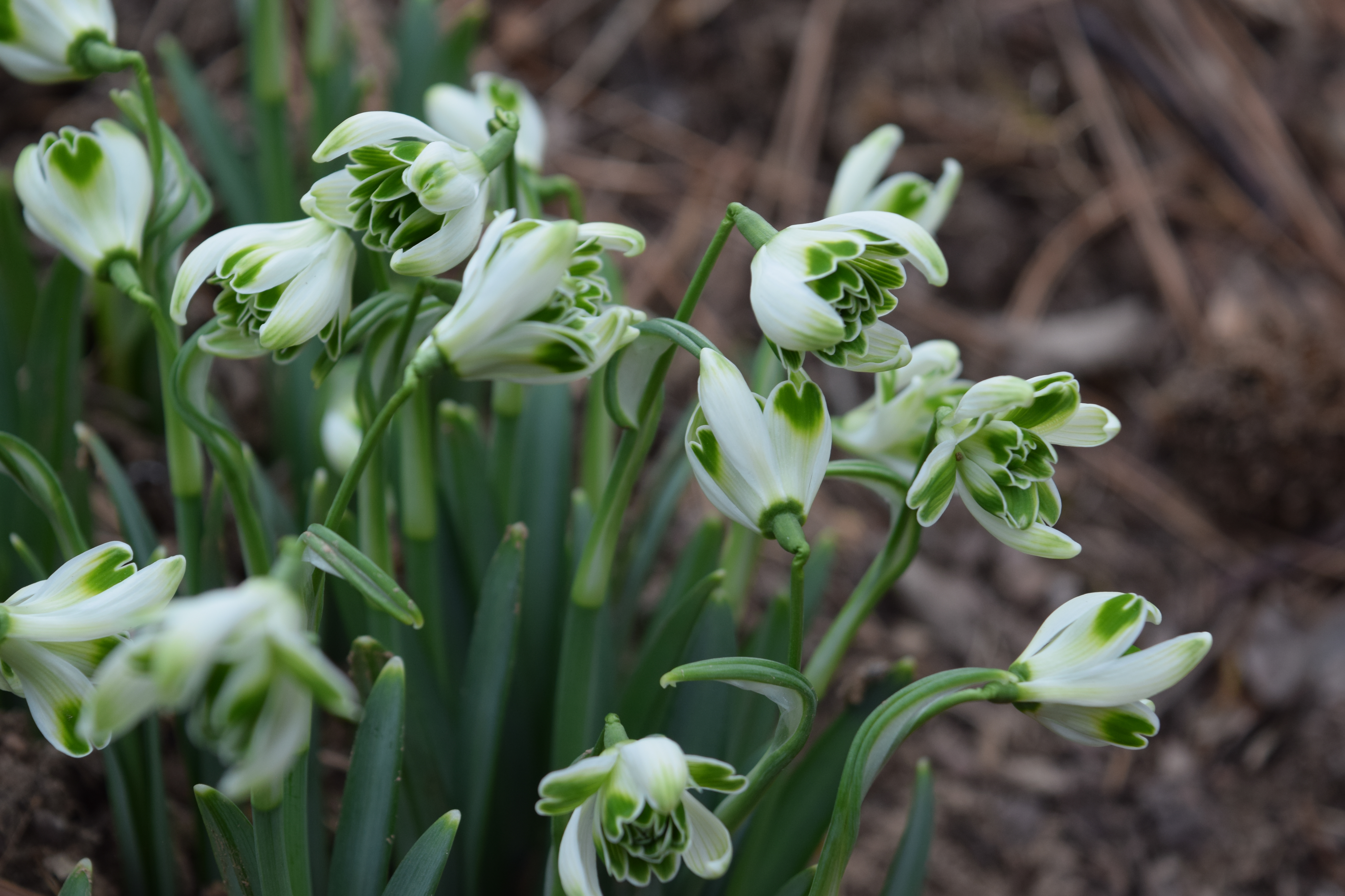 Snowdrop flowers are all white, but beyond that, the variability comes from green, or occasionally yellow markings. Sometimes there are several green dots, or maybe only one. The leaves also vary from glaucous gray-green to bright green, narrow or wide, short or long. The leaves are all strap-shaped and even the Giant snowdrop leaf is only a foot long at the maximum.