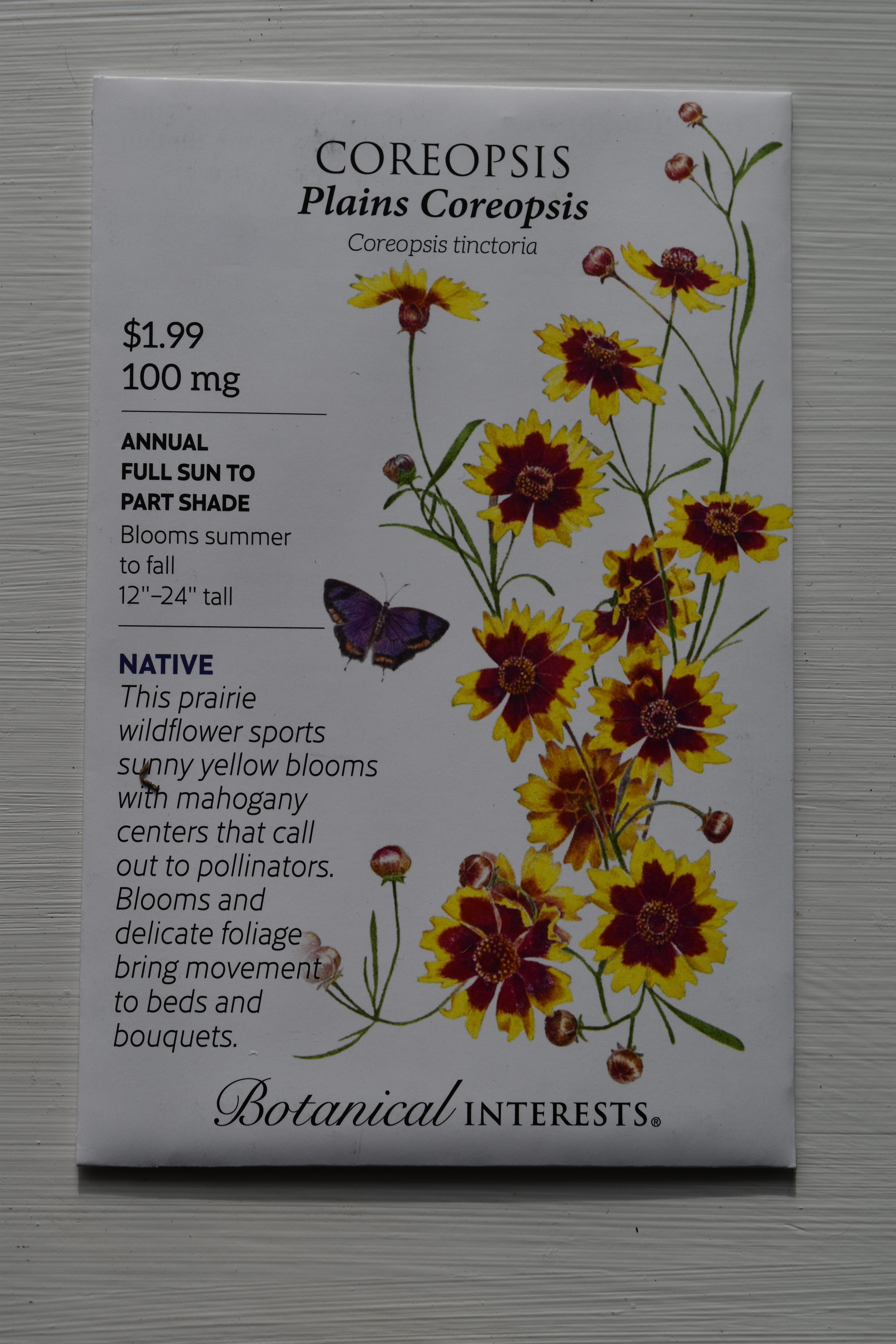 Hanna is excited to grow Coreopsis tinctoria. It is a native that attracts butterflies. We do a lot of planting for pollinators so even if plants are not native, we grow single flowers (as opposed to double fluffy flowers) so that passing pollinators can access pollen and nectar easily. There is a seed-grown dahlia that Hanna is going to grow for this reason. It is called ‘Bishop’s Children’. You may be familiar with the bright red single dahlia with dark foliage called ‘Bishop of Llandaff’ that is the darling of gardening magazines and flower beds, these are cross-pollinated seeds from those parent plants. We will see what we get.