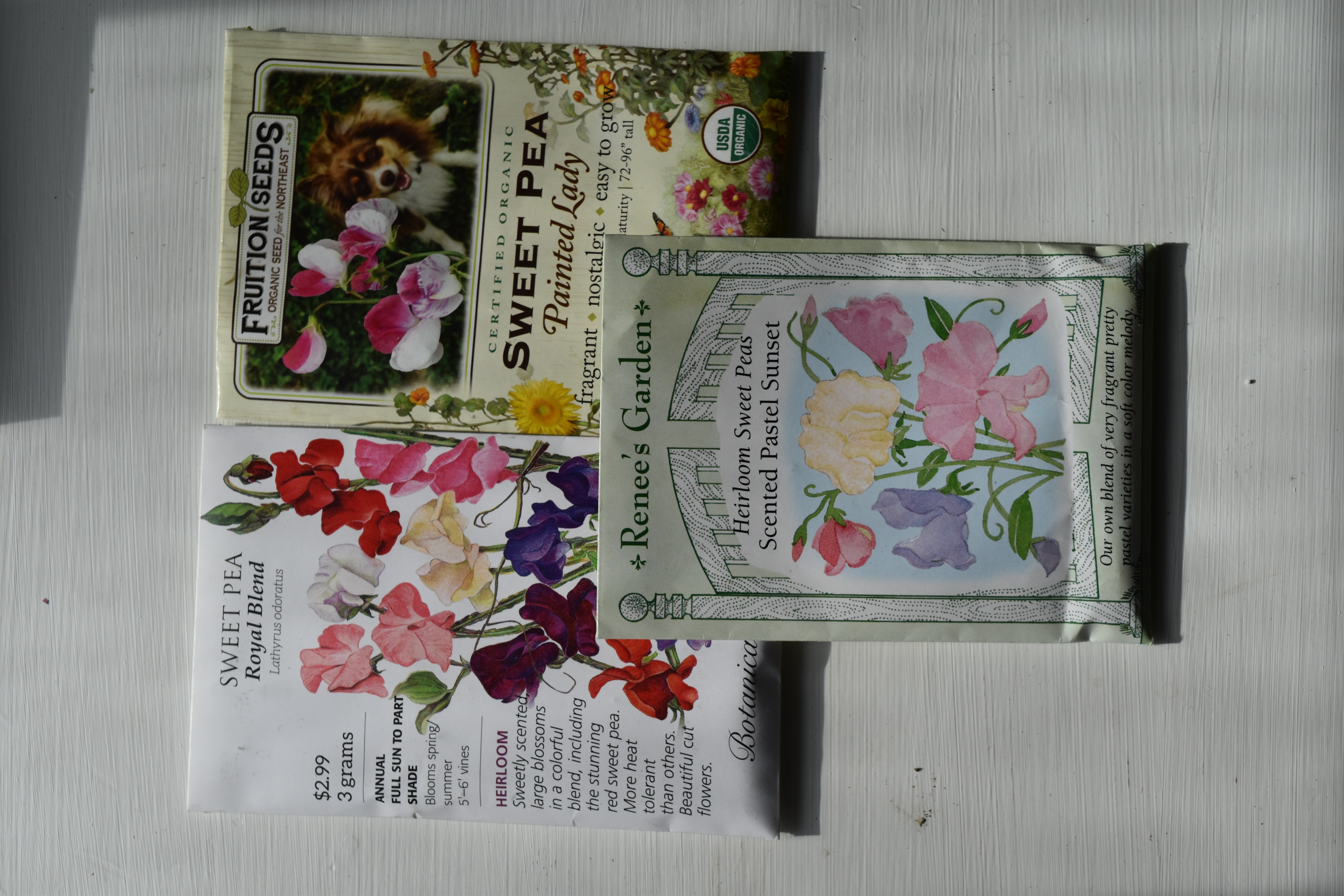 In my old garden in Buckingham, England, I would poke seeds in a zig-zag row beside a trellis attached to a six-foot-high fence. All the seeds would easily germinate and produce endless flowers to pick every day. Here we try every method possible to get my coveted sweet peas. We plant some in fall, some in an unheated greenhouse, and then some in the ground on St. Patrick’s Day (March 17th). You may ask – is it worth it. To me, it is for one whiff of that delicious sweet pea scent.