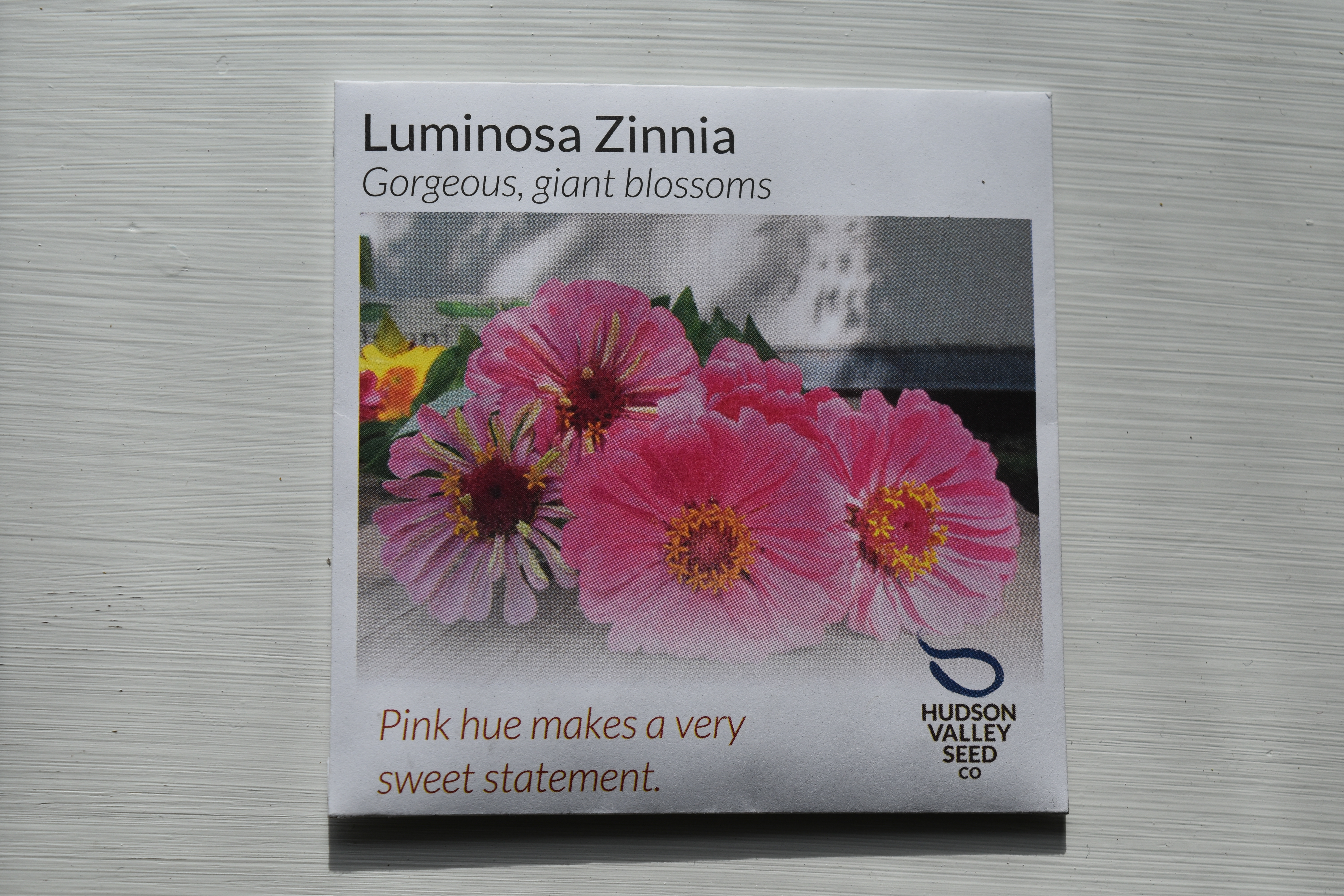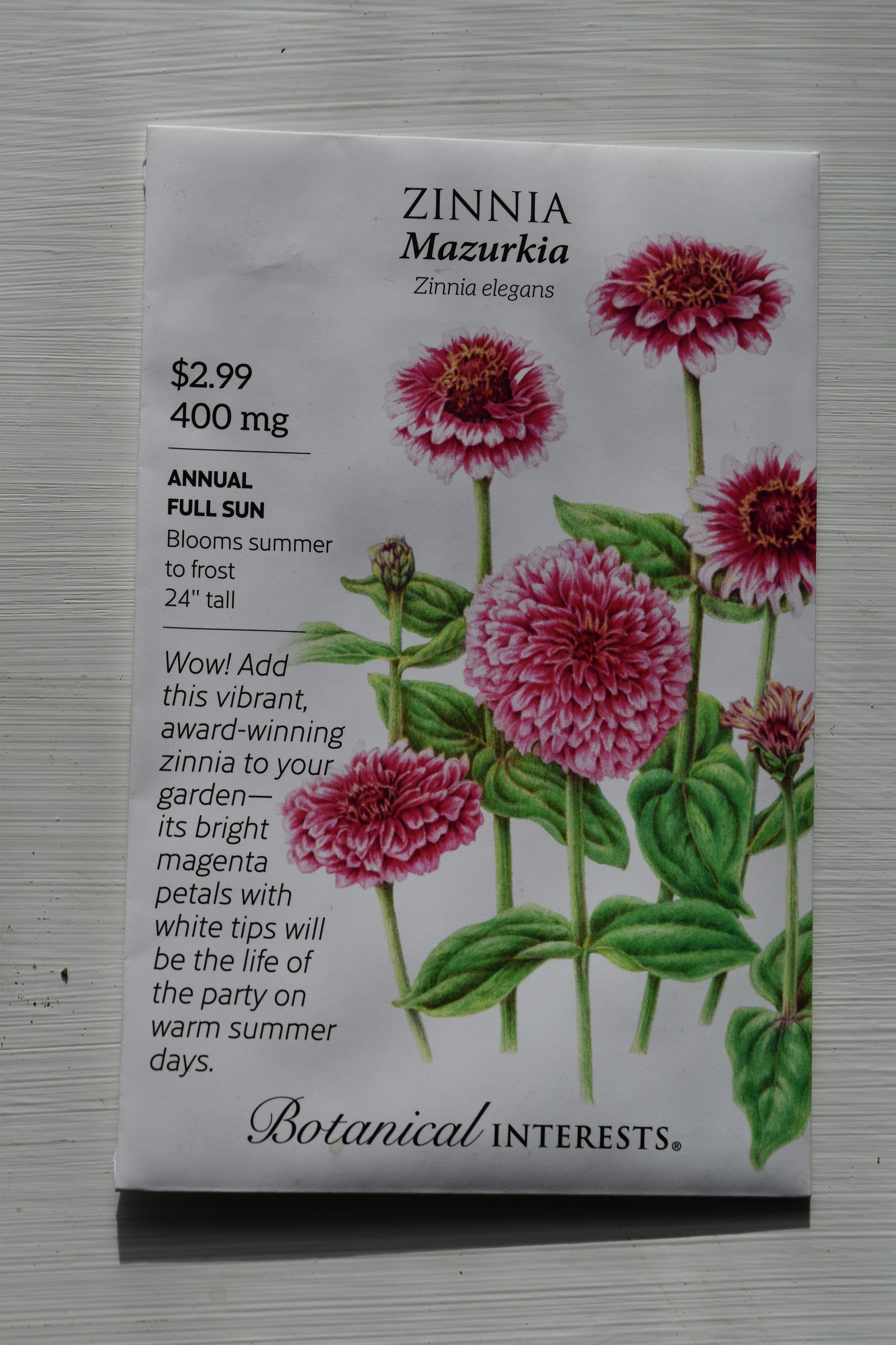 I have my eye on several lovely zinnias. There is a new one that is pink with white tips to the petals called Zinnia ‘Mazurska’. It looks fantastic on the packet – we will have to see how it looks in my garden and vase. I like to have a variety of sizes of zinnias to use in different-sized arrangements, so I will be growing the diminutive button-like ‘Thumbelina’ and a glowing pink one called ‘Luminosa’. The old favorites are sometimes the best and the most reliable, so I always grow ‘Cut and Come Again’. I have lots of packets of that one Hanna tells me. Hanna is going to try a new zinnia that is called Cupcake series mix. Sounds interesting but also confusing since we also grow Cosmos ‘Cupcakes’. Surely there are other names that the plant namers could use.