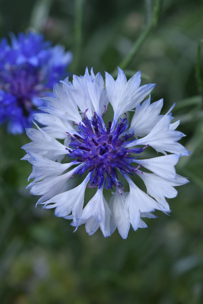 A bicolored cornflower in my garden with a blue one behind it.