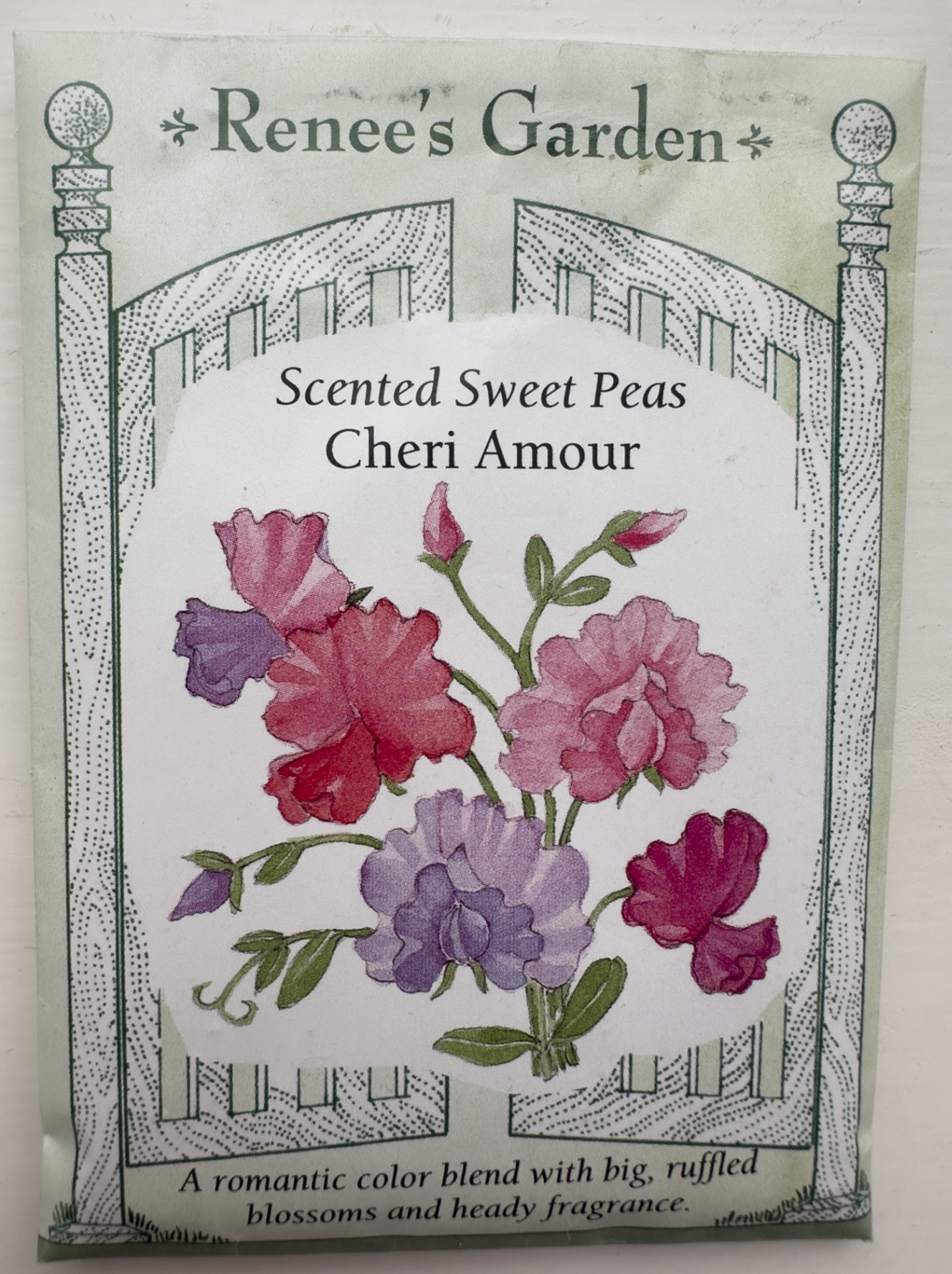 Cheri Amour Sweet Pea packet from Renee’s Seeds. The flowers have a ‘heady fragrance’