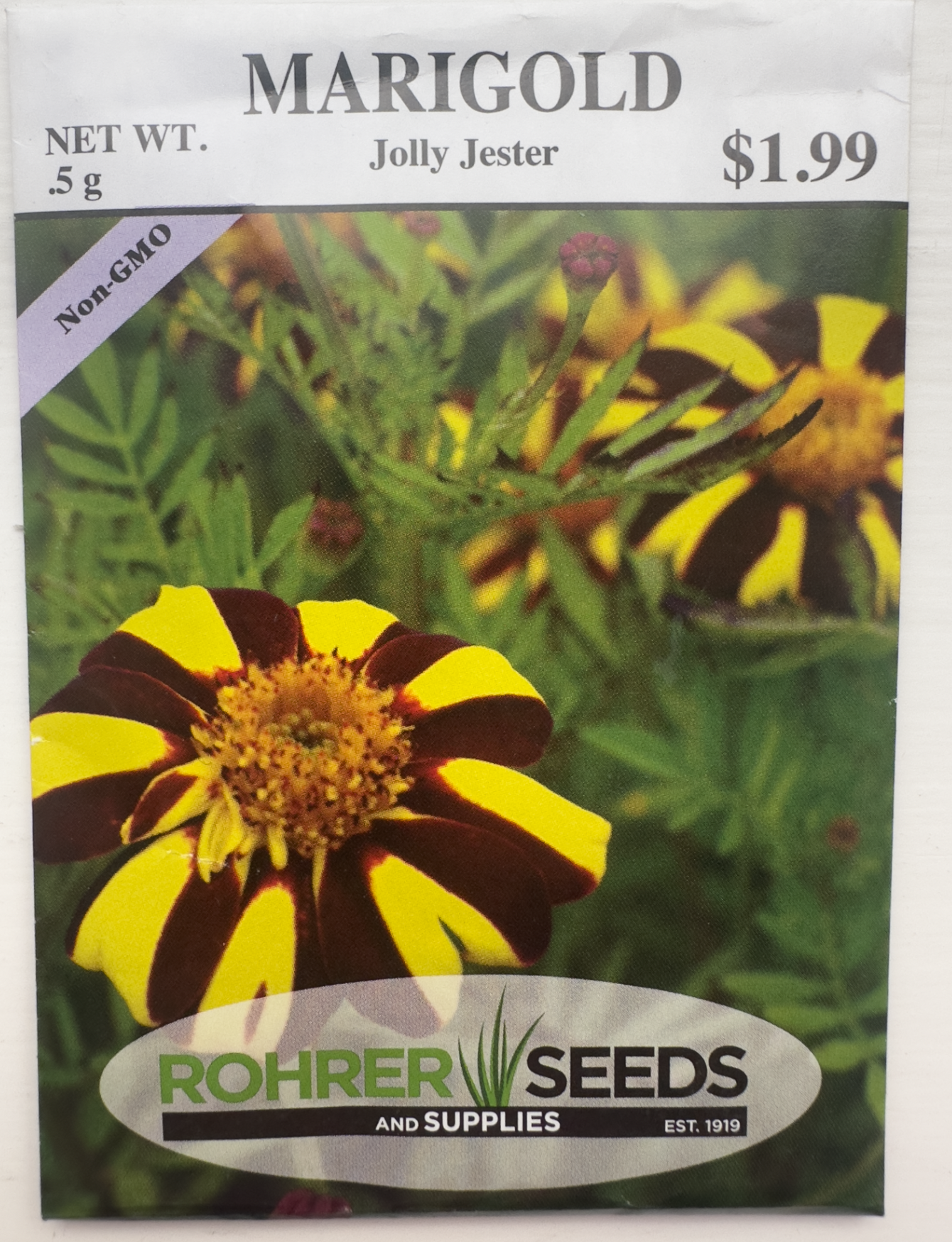 Jolly Jester Marigold Seed Packet from Rohrer’s Seeds.