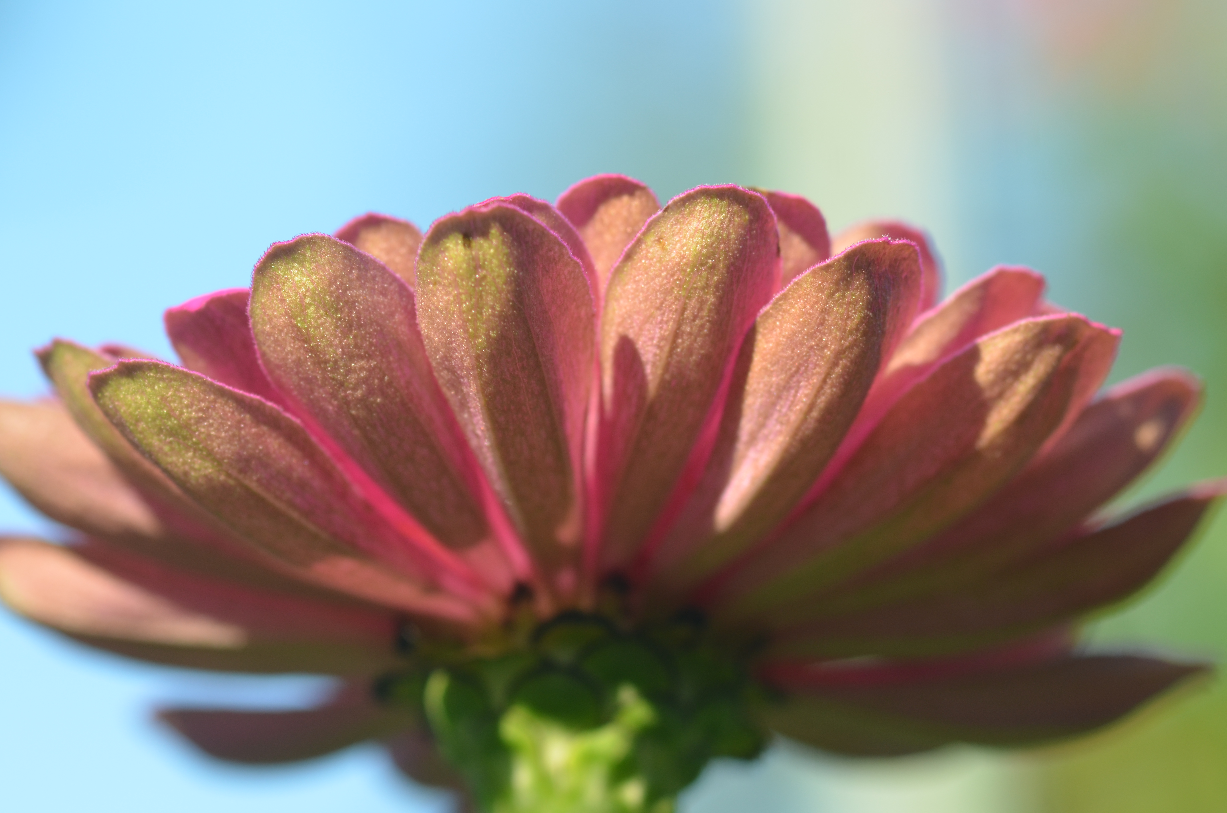 Here is the underside of an ordinary zinnia flower. By a concerted scrutiny of something so familiar you see with fresh rather than jaded eyes. The cell structure glistens in the morning dew. Subtle shadings of color, usually unnoticed, lend depth and beauty. Use your skills of observation and gain enjoyment from subtle differences from day to day.
